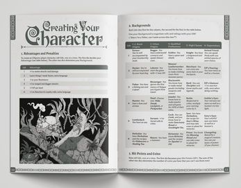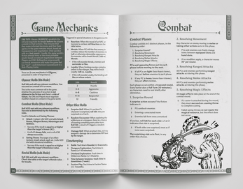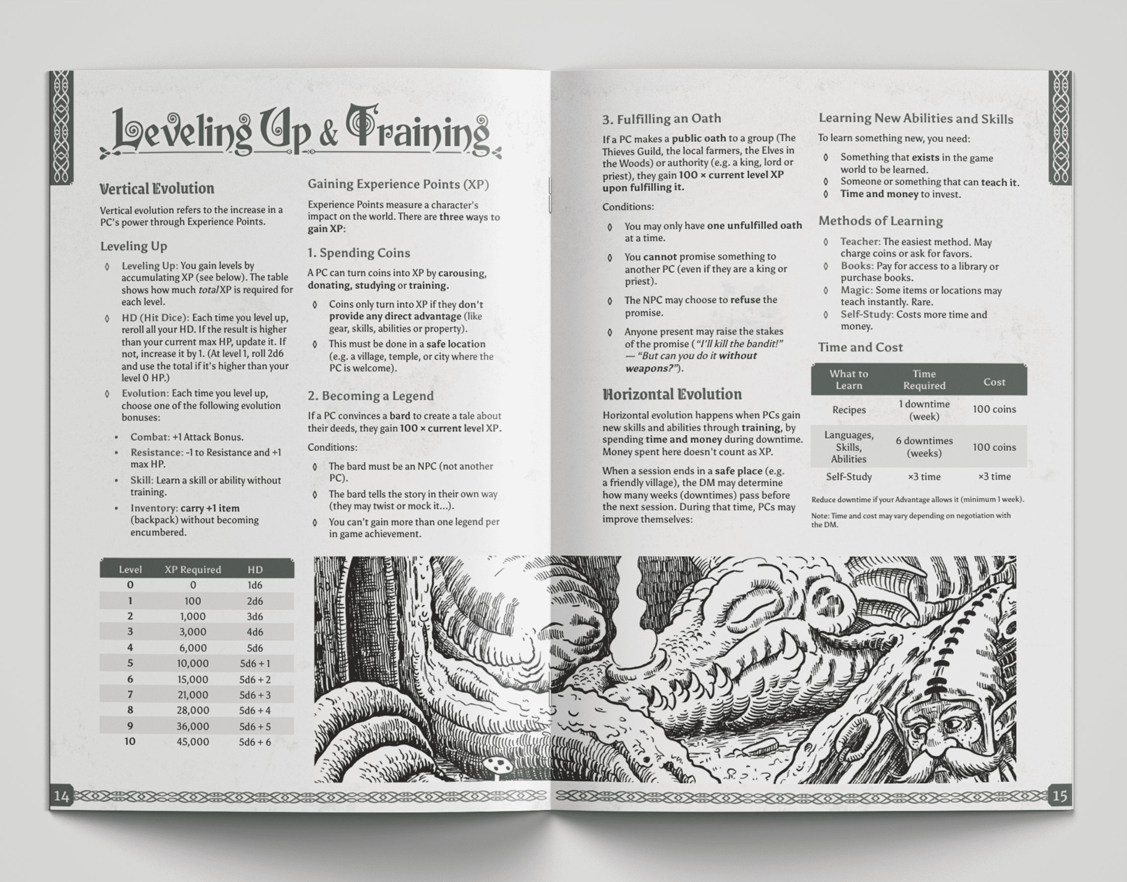 We tried to push it as far as possible in an effort to “consolidate ruthlessly,” as stated in The Goblin Laws of Gaming (GLOG). We made efforts to create something that allows for the play style hinted at in texts such as Quick Primer for Old School Gamers, Principia Apocrypha, Muster, New Simulationism, BLORB and the Oil Fantasy manifesto (yeah, you don’t know this one if you’re not from Brazil). A lot of New School Revolution sensibilities, all of those shiny, pretty blog posts everywhere (sorry everyone for not referencing the originals—I couldn’t keep track of who wrote what in the last 20 years or so).